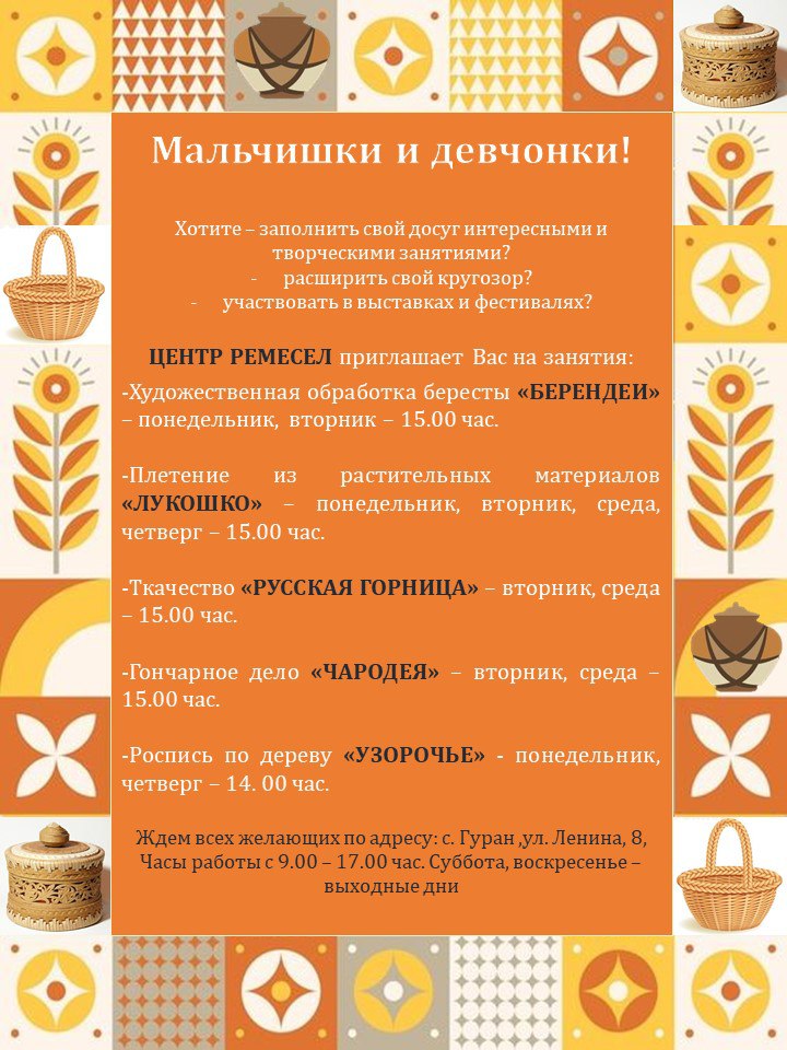 Центр ремесел открывает свои двери для юных жителей Гуранского сельского поселения, предлагая возможность прикоснуться к истокам народного творчества и овладеть традиционными ремеслами. Нашей целью является сохранение и популяризация культурного наследия, передача знаний и умений от опытных мастеров подрастающему поколению.