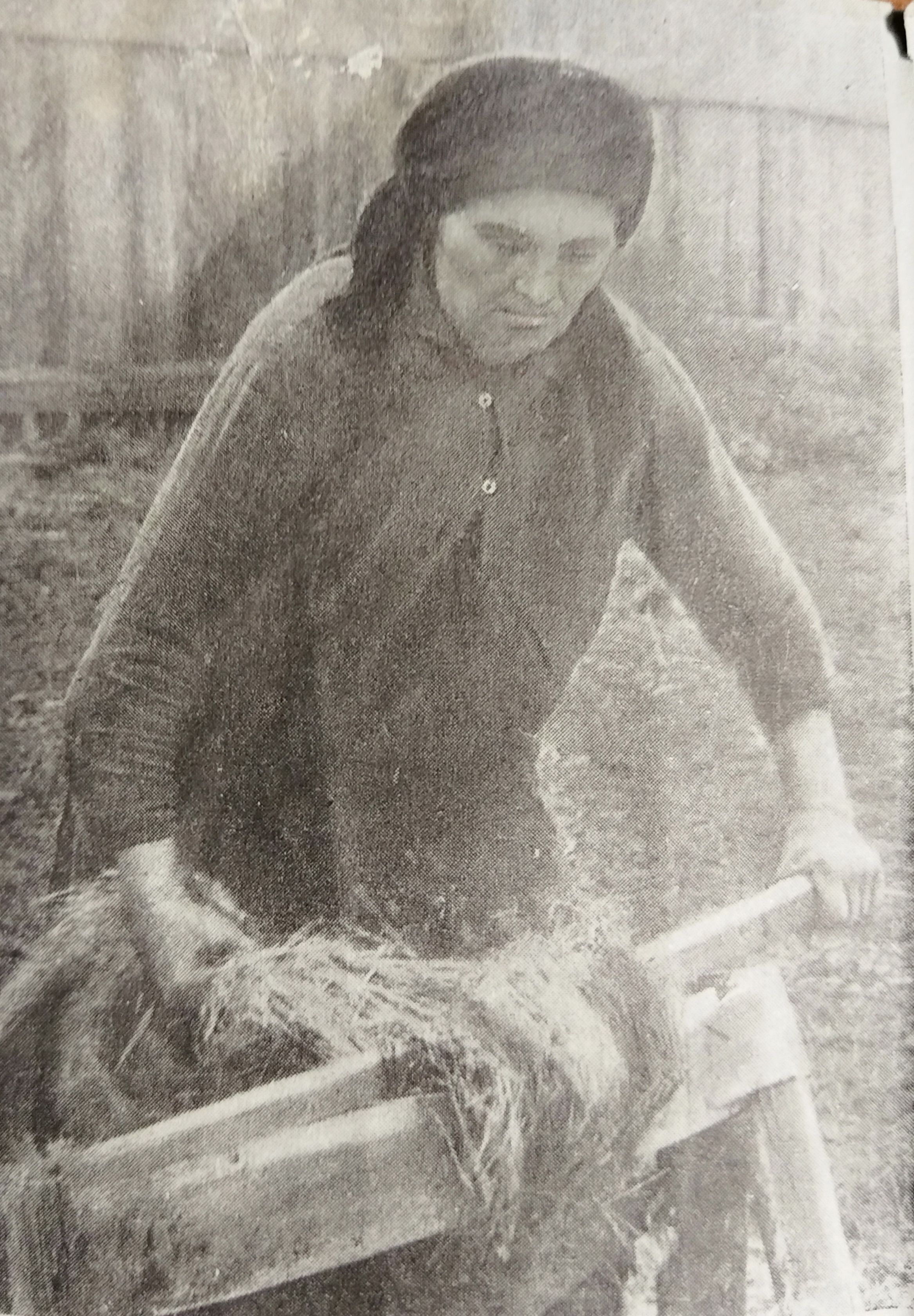 По воспоминаниям Домны Федоровны, техника обработки льна была такова: «Сеяли лён обычно во второй половине мая, но следили, чтобы почва была достаточно влажной и теплой. Лён сажали, в хорошо обработанную землю. Основной уход за посеянным льном заключался в прополке. Сорные травы могли заглушить молодые всходы. Высота льна была примерно сантиметров 80. Лён цветет мелкими голубыми цветочками. «Лён цветёт только до обеда»- говорила Домна Фёдоровна. В августе месяце, когда лён поспевал, его вырывали и расстилали под августовские росы». Чтобы он вылежался. Затем собирают в снопы и переносят в сухое место, для неё сушилкой была баня легко протопленная. Когда лён просушился, его мнут мялкой, чтобы отлетела треста. Сухая треста легко ломается. Берут одной рукой, хлопают деревянной челюстью мялки, другой подсовывают горсть тресты. Остатки не выбитой тресты вычёсывают при помощи гребня и гребёночки. Но когда ломался гребень, выходила из положения на самодельной доске с гвоздями. Клубок очёсанного льна, затем куделю разворачивают, крепят к пряслице, и прядётся нитью на прялку. Для получения цветных льняных нитей окрашивала натуральными красителями, например, луковую шелухой, зелёную травой, корой черёмухи. Сначала надо вскипятить воду в чугуне, туда опустить пряжу натуральный краситель, который был необходим, также добавляли горсть соли, чтобы краска хорошо закрепилась на пряже. Всю ночь пряжа находилась в чугуне в русской печи. Утром вынимала пряжу, сушила. Потом устанавливала, кросны так называют ткацкий станок. И нанизывала нити. Чтобы появился рисунок на покрывале, нужно было высчитать данный рисунок». В конечном итоге у Домны Фёдоровны получались покрывала с необычными рисунками. Техника выращивания и обработки льна, по воспоминаниям Домны Федоровны, была не только важной частью сельскохозяйственного труда, но и частью культурного наследия, отражающего трудолюбие и мастерство предков. Лён на протяжении многих лет спутник женской судьбы. Многое связано с ним, начиная с холщовых пелёнок, через девичьи наряды, кончая саваном – белой холстиной, покрывающей человека на смертном одре. Жизнь женщины складывалась так, что она с ранних лет должна была готовить приданое к свадьбе. Поэтому и работы со льном ей было не избежать. В каждом роду есть свои хранители памяти, те, кто бережно передает из поколения в поколение истории предков, их радости и горести, их мудрость и их наследие. Татьяна Ивановна Шеповалова (Кирсанова), родившаяся в 1974 году в селе Большой Одер, – одна из таких хранительниц. Она – внучка Домны Федоровны, женщины, чья жизнь стала воплощением стойкости, трудолюбия и безграничной любви к своему роду. «Прожила моя бабушка очень трудную жизнь», – начинает свой рассказ Татьяна Ивановна, и в этих словах слышится не только скорбь, но и глубокое уважение к силе духа своей бабушки. Домна Федоровна была женой раскулаченного мужа, который, вернувшись из ссылки, вскоре умер от туберкулеза. Голод и болезни забрали у нее семерых детей. Трудно представить себе горе матери, пережившей столько потерь. Но Домна Федоровна не сломилась. Она трудилась с раннего утра до позднего вечера, находя силы жить и бороться за будущее. Несмотря на все тяготы, Домна Федоровна была человеком удивительной культуры и мудрости. «Сколько песен, обрядов, народны